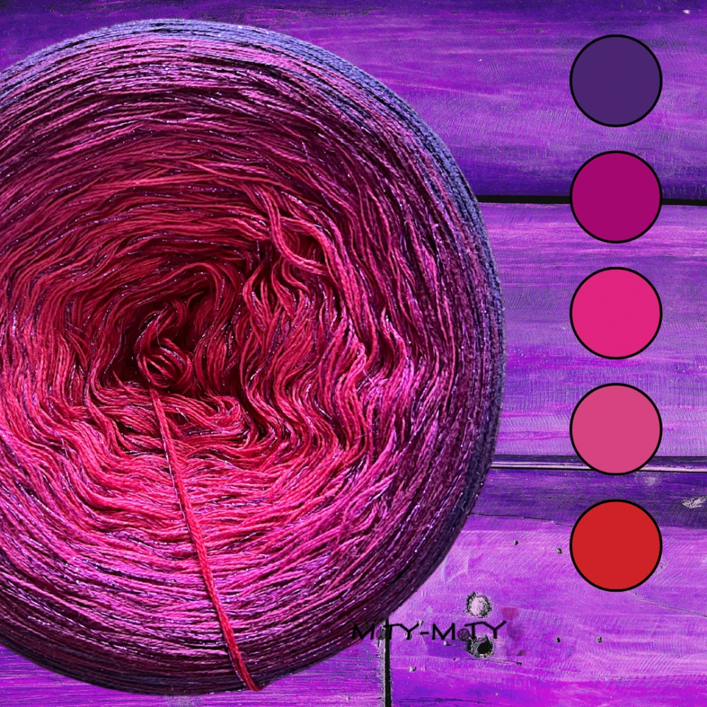 barevné složení: od tmavé fialové přes růžovou po červenou doplněnou fialovým lurexem