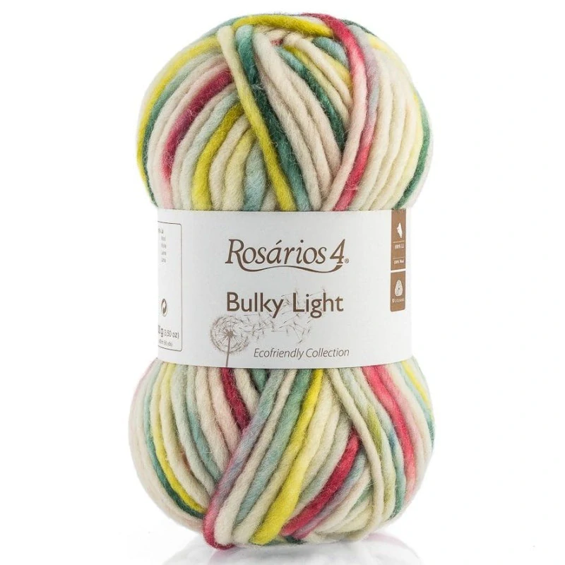 Příze Rosarios Bulky Light Print je měkká, hustá příze vyrobená ze 100% vlny. Je ideální pro výrobu lehkých, ale zároveň teplých oděvů – svetrů, ponožek, šál a čepic. Potisk znamená, že příze je vícebarevná a skvrnitá.