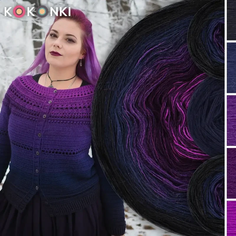 Sada na svetr/kardigan Nathalie od Kotek i motek 06 / Kokonki Merino / tmavá modrá/benzín/fialová/švestková/tmavý cyklámen + vzor PDF